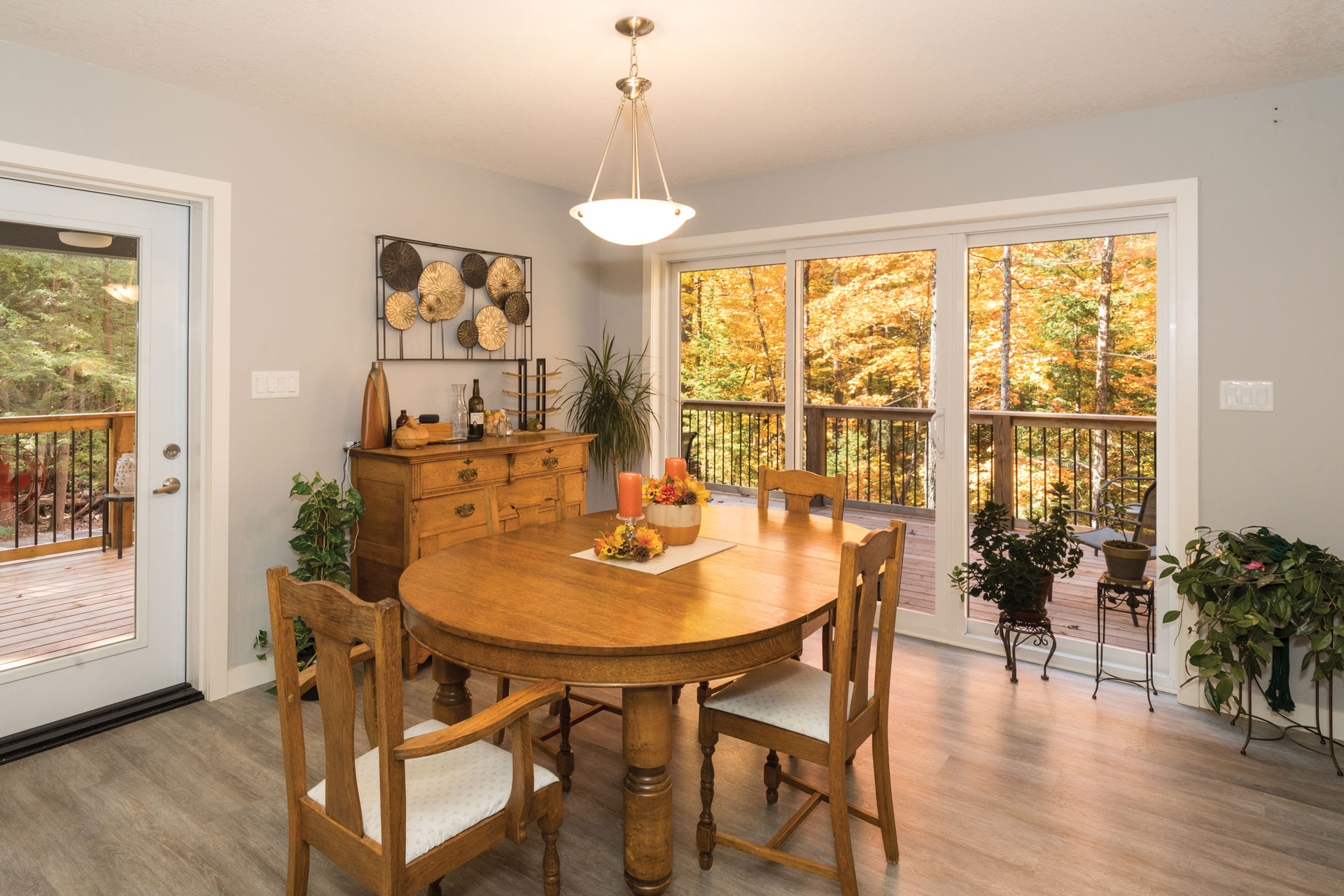 One of their favourite design decisions was repositioning the deck to better suit the angle of the sun, allowing them to enjoy sun all day long. “As well, we replaced the patio door with a floor-to-ceiling window for the living room,” says John. “I didn’t want to always be looking out at a railing. I wanted to enjoy the amazing views of the tall pines, maples, and other trees on the property.” Sharon adds, “people come through the front door and their jaws drop immediately looking out that window.”