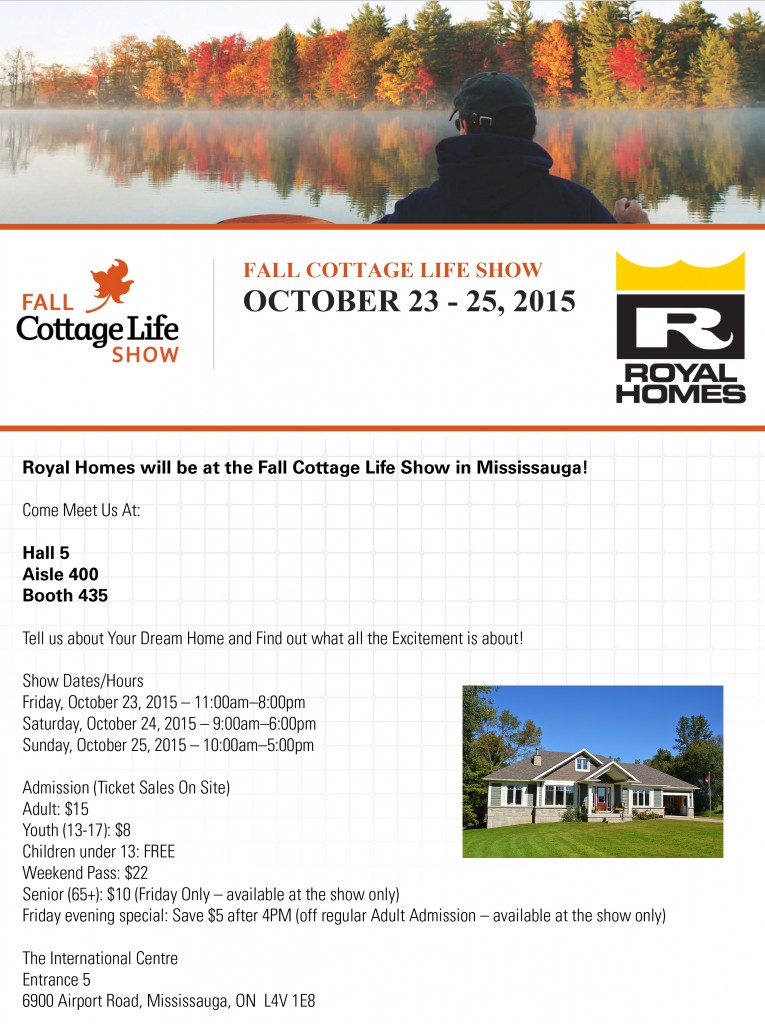 — Royal Homes will be at the Fall Cottage Life Show in Mississauga! Come Meet Us At: Hall 5, Aisle 400, Booth 435 Tell us about Your Dream Home and Find out what all the Excitement is about! Download PDF HERE