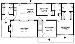 Royal Homes uses thick black lines to indicate walls, with the line thickening slightly to indicate bearing walls or exterior walls. A V line, as in the doorway of the Citadel indicates folding doors. If you look at the same design, you will see a pocket door in the two-piece bathroom at the entry from the garage. Royal Homes also uses arrows to indicate the entries from the outside. This helps you to understand the access to the home. As you can see when you look at the Citadel, the bank of windows in the great room includes three doors in a bank of French doors. If you were to choose this design, you may choose to include outdoor opening doors in the full bank of doors.